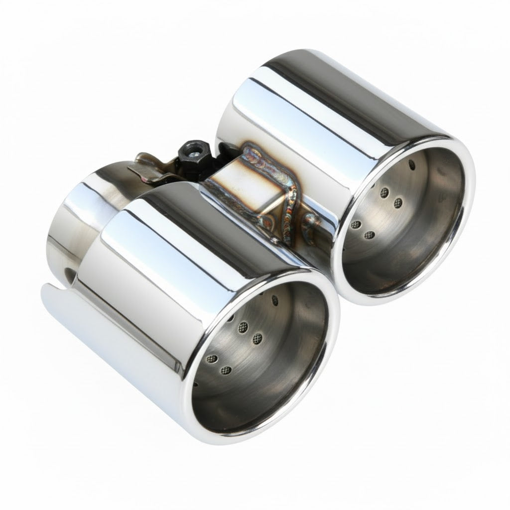 Cette paire de sorties en Inox chromé a un design exclusif SCART. Les perforations internes et le petit grillage de protection sont purement esthétique. Nous avons voulu les faire en sorties droite pour rappeler les Sport Classic et le Speedster. Elle sont neutres du point de vue sonore. Elles viennent en remplacement de celles d'origine en se montant sur les silencieux.